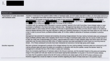 Note: we have moved away from the original allegations of hardware booked as software and that hardware revenues should not be counted as revenue. Now that it has emerged that HP knew about hardware, the argument has shifted to the sales being of the wrong type of hardware.